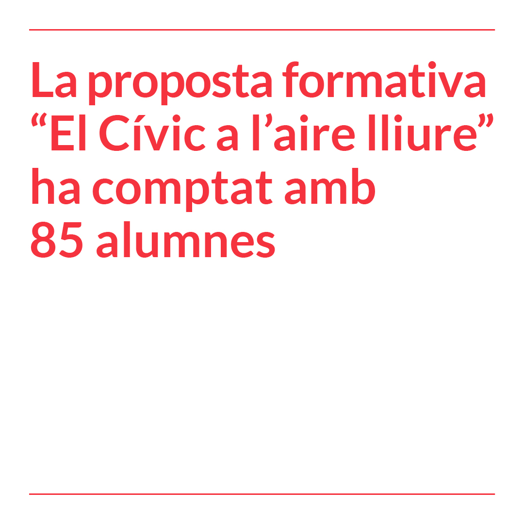La novetat del curs, la proposta formativa “El Cívic a l’aire lliure”, ha comptat amb 85 alumnes en 9 activitats diferents. Una iniciativa que repetirem el curs que ve com a banc de proves de propostes noves per incorporar a la futura programació o tallers que necessiten l’exterior i la bonança per poder-se dur a terme.