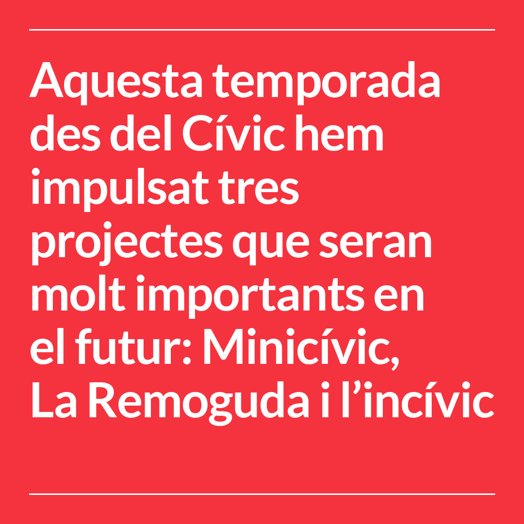 Aquesta temporada també hem impulsat tres projectes que seran molt importants en el futur: Minicívic, La Remoguda i l’incívic. Us convidem a no perdre la pista d’aquests projectes perquè el curs que ve ens sorprendran!