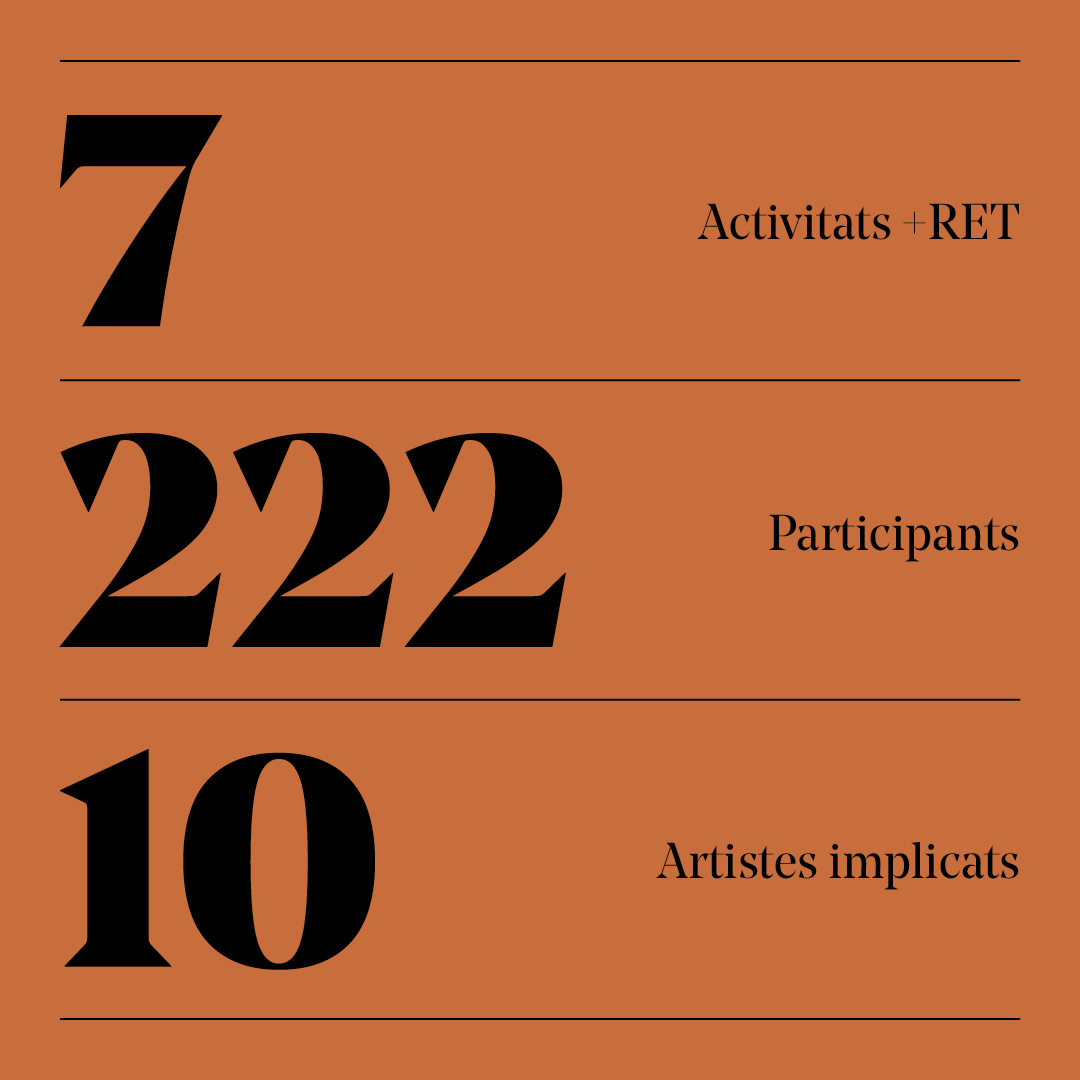 Les set activitats complementàries programades per aquesta edició han comptat amb 222 participants en total. Les activitats complementàries +RET ens han permès apropar 10 artistes i la seva obra no només als espectadors, sinó també a la gent gran, les escoles, l'institut o la biblioteca, amb funcions, tallers i altres activitats.