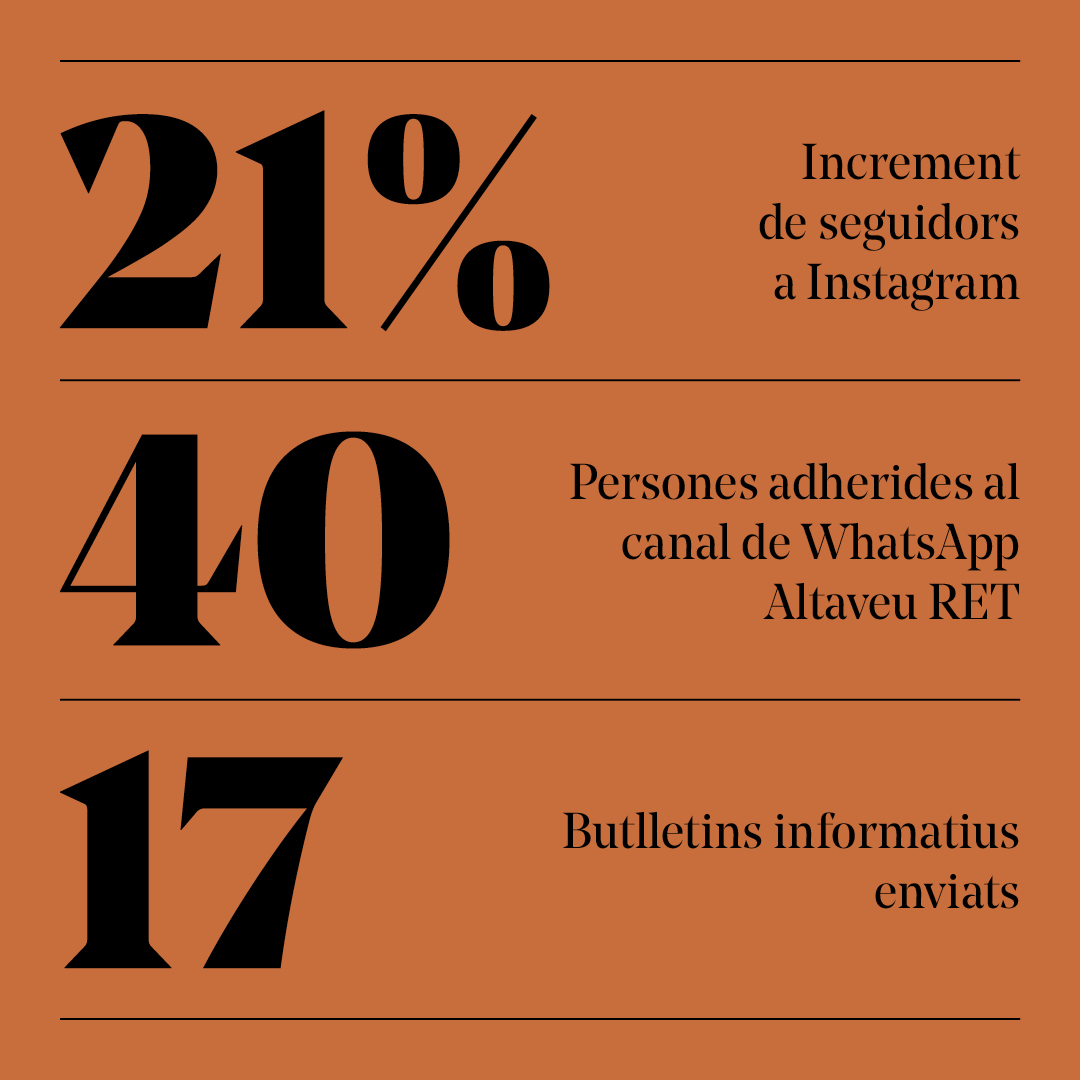 Aquesta temporada hem incrementat en un 21% els seguidors a Instagram i hem sumat 40 persones al canal de WhatsApp Altaveu RET, el nostre canal de comunicació directa on pots estar al dia de totes les novetats de RERELTELÓ i gaudir de descomptes i ofertes especials.