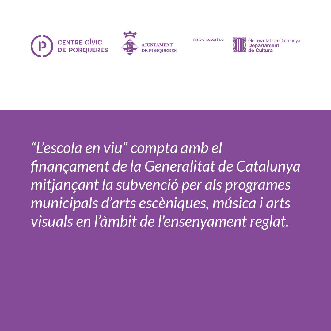 Els últims anys la programació d’arts en viu a Porqueres s’ha consolidat com una proposta cultural de qualitat, professionalitzada i sobretot amb una línia de programació singular i complementària a l’oferta cultural del territori. És des d’aquesta mirada, que neix el projecte “L’escola en viu” adaptada a les característiques del Centre Cívic que treballa amb una programació pensada per viure la cultura de ben a prop.