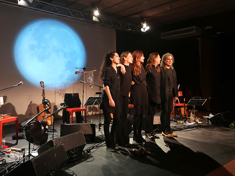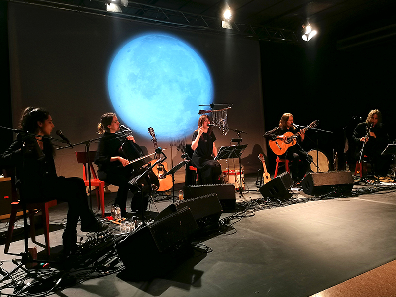 La lluna és protagonista en l’espectacle, una posada en escena del que vol ser la cova musical de Biterna de Maria Rodés. Biterna és, en l’imaginari dels Països Catalans, el lloc mític on les bruixes invocaven el boc. I ha servit a la cantant, en aquest camí geogràfic d’investigació, per compondre Les bruixes tornen , que recupera en la lletra els versos que Jaume Roig va escriure al segle XV a l’Espill o llibre de les dones: “Amb cert greix fus, / com diu la gent, / se fan ungüent / e bruixes tornen.” Interessant cançó que fusiona el gemec instrumental, disbauxa de l’hora bruixa, amb les veus empastades que funcionen com carícies.